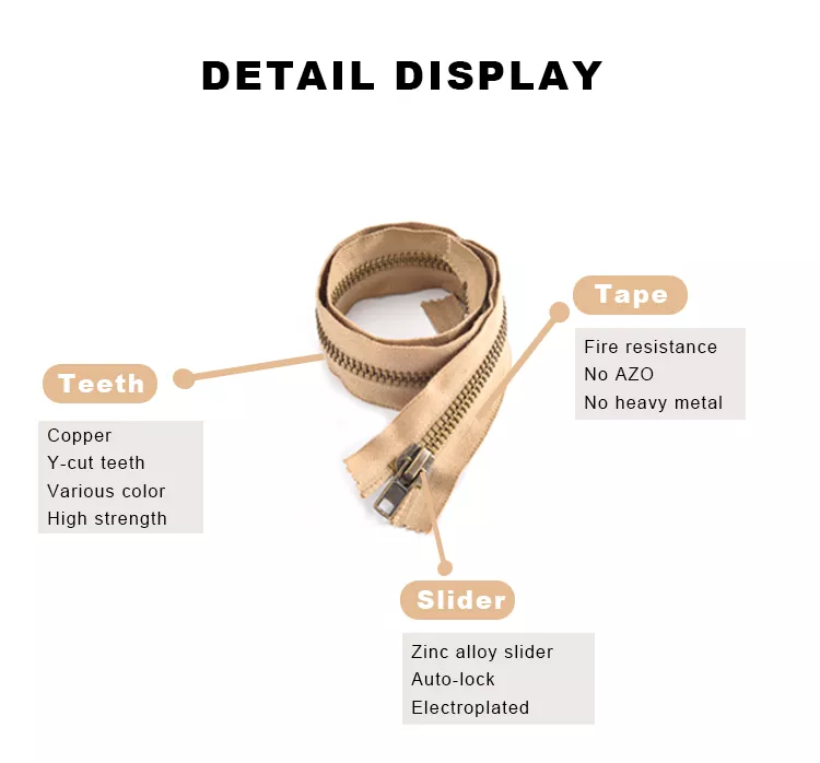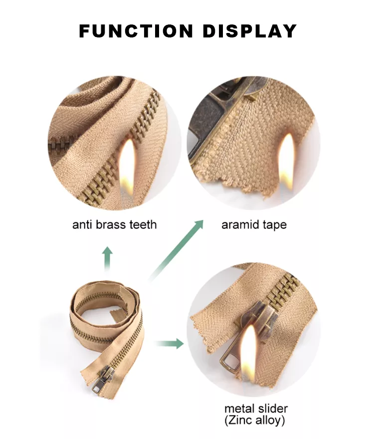 Zip logam tahan api TRC menggunakan pita kalis api dengan ciri pemadam sendiri, yang menghalangnya daripada terbakar atau terbakar di udara, menggabungkan keselamatan dan ketahanan. Rintangan haba yang sangat baik memastikan bahawa walaupun terdedah seketika kepada suhu tinggi 300°C, ia tidak akan mengecut, menjadi rapuh atau cair, menjadikannya pilihan yang ideal untuk aplikasi perlindungan tinggi.