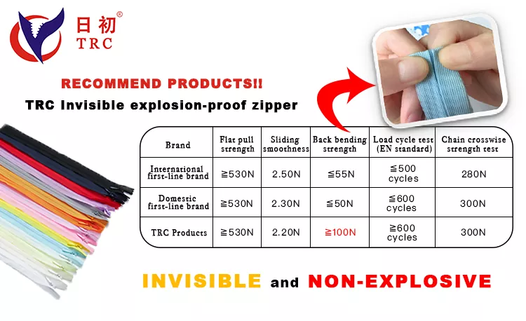 Zip kalis letupan TRC Invisible (Pita Renda) menggabungkan keanggunan dengan ketahanan dengan lancar. Pita renda yang indah meningkatkan daya tarikan visual pakaian sambil mengekalkan prestasi cemerlang yang sama seperti zip standard.
