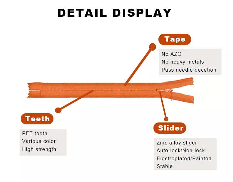 TRC Invisible Explosion-proof Zipper(Normal Tape)menggabungkan penampilan yang halus dan bersahaja dengan ketahanan yang luar biasa. Setiap zip dibina daripada pita poliester yang ditenun ketat dan gigi nilon berkekuatan tinggi, memastikan penutupan yang licin dan sekata yang kekal tersembunyi dengan sempurna di dalam pakaian.
