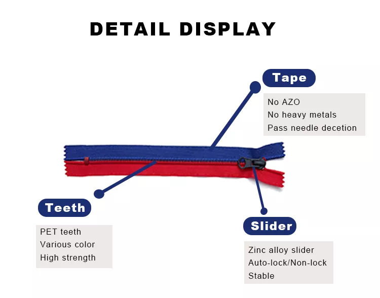 Struktur saling mengunci unik ini memberikan keserasian dan kepelbagaian yang luar biasa, menawarkan pengguna penyelesaian sambungan yang lebih mudah dan cekap. Sama ada untuk pakaian, bagasi, peralatan luar atau aplikasi tekstil modular, zip nilon yang saling mengunci TRC menjamin prestasi yang boleh dipercayai dan kualiti yang konsisten.