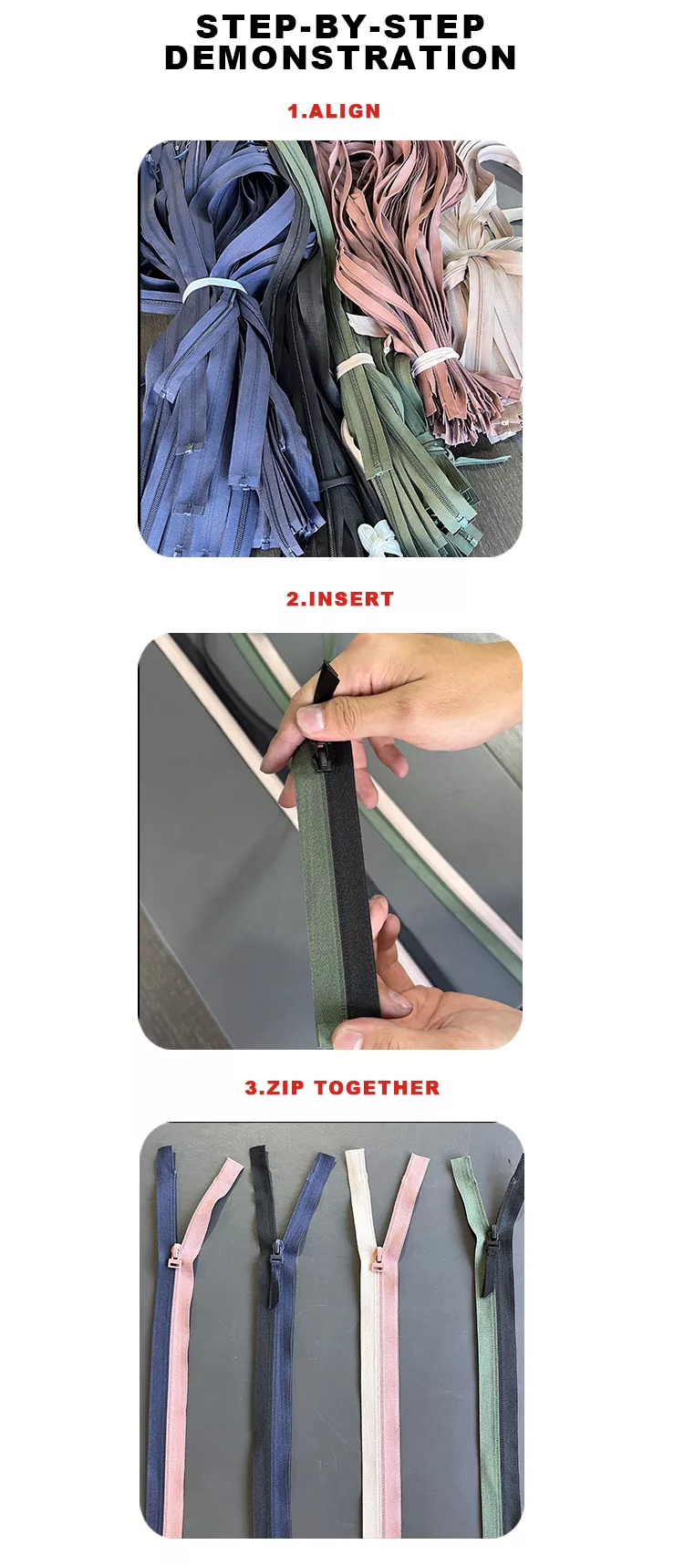 3. Semua zip kami boleh bersambung dengan lancar tanpa mengira warna, panjang atau kumpulan pengeluaran.