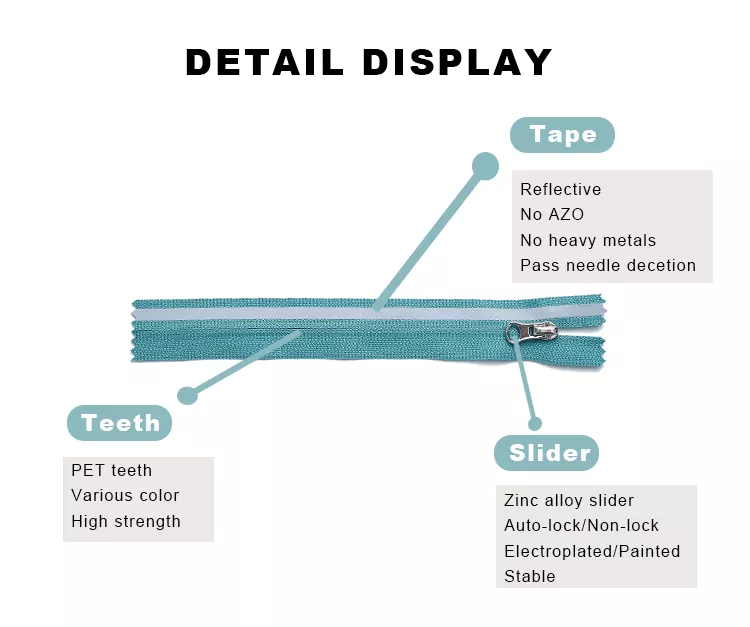 TRC, pengeluar China yang mengkhusus dalam ritsleting, menggabungkan teknologi tenunan dan salutan termaju untuk menghasilkan ritsleting nilon dengan jalur pemantul. Ini menghasilkan pemantulan yang tinggi dan ketahanan yang luar biasa. Gigi nilon zip reflektif ini memastikan operasi yang lancar dan kekuatan tegangan yang tinggi, menjamin prestasi yang boleh dipercayai walaupun dengan penggunaan yang kerap.