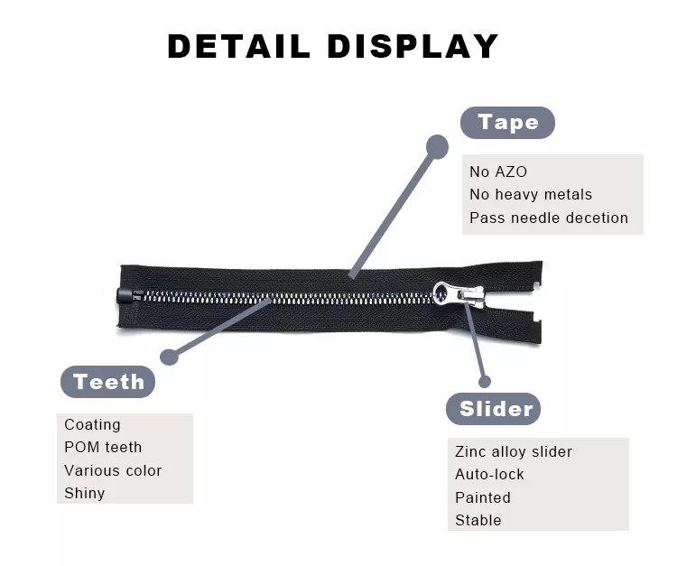 Zip bersalut plastik TRC mempunyai salutan permukaan khusus yang digunakan pada struktur rantai bergigi resin konvensional, menjadikan gigi lebih licin dan padat. Ini dengan ketara meningkatkan kelicinan produk dan rintangan haus. Pada masa yang sama, lapisan salutan secara berkesan meningkatkan rintangan pengoksidaan dan perlindungan kelembapan gigi, sambil memberikan kilauan tersendiri pada penampilan, menggabungkan fungsi dengan daya tarikan estetik.