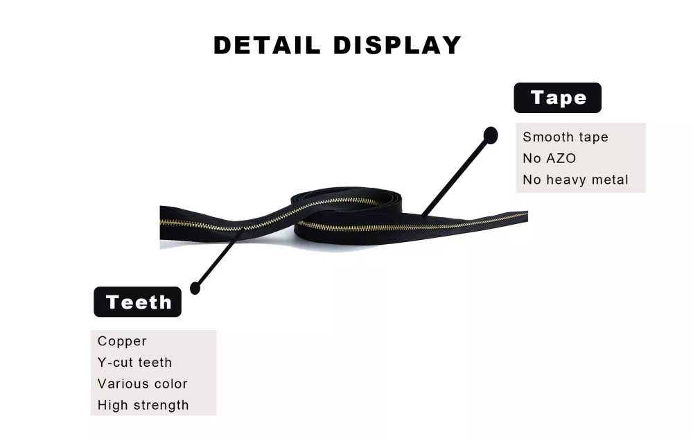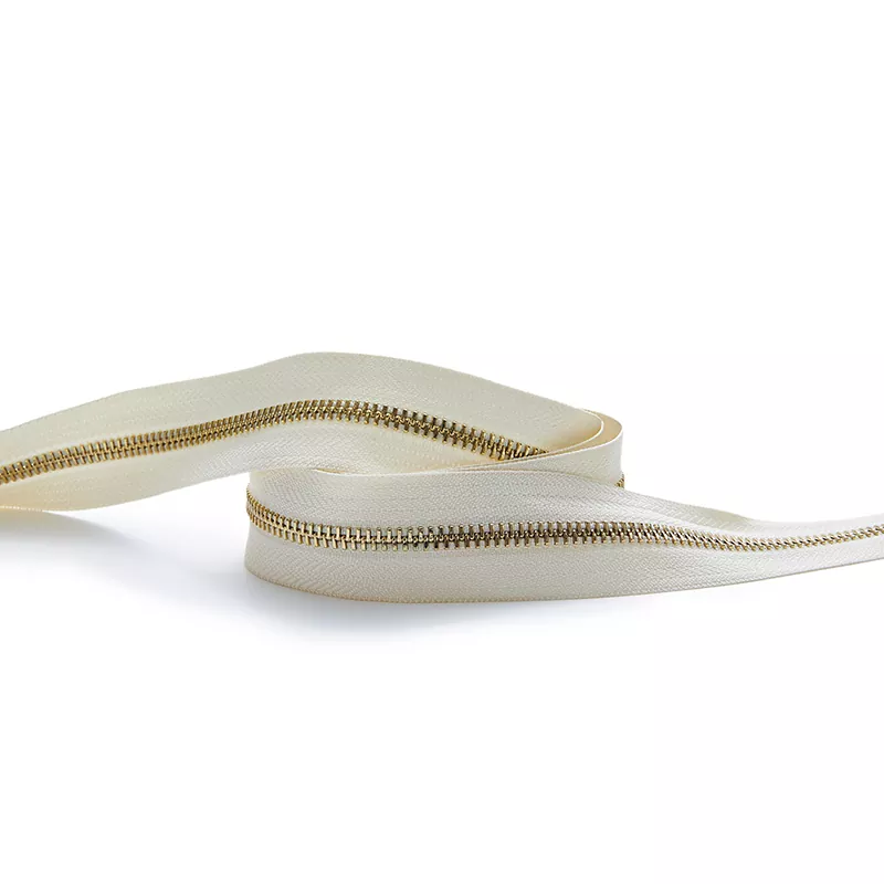 Zip logam standard TRC menggunakan gigi loyang atau nikel berkekuatan tinggi, memberikannya rintangan haus yang sangat baik, rintangan basuh dan prestasi menyeterika tahan haba. Di samping itu, ia boleh didapati dalam warna popular seperti emas champagne, menjadikannya sesuai untuk seluar jeans, jaket, dan pelbagai jenis pakaian lain.