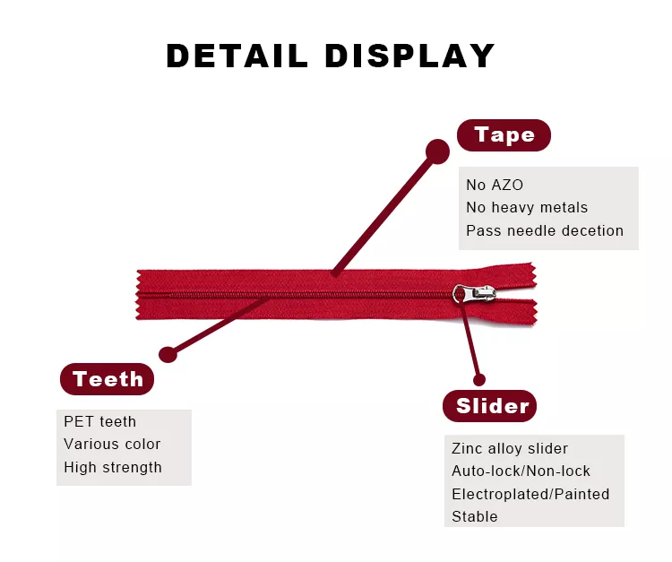 Zip nilon standard TRC direka dengan teliti daripada poliester berkualiti tinggi dan gigi nilon berkekuatan tinggi. Reka bentuknya yang ringan namun teguh memastikan pembukaan dan penutupan yang lancar, serta ketahanan yang sangat baik. Antara ritsleting yang paling banyak digunakan, produk ini menawarkan ketahanan yang luar biasa dan rasa selembut sutera, menjadikannya sesuai untuk pakaian, bagasi, linen dan peralatan luar.