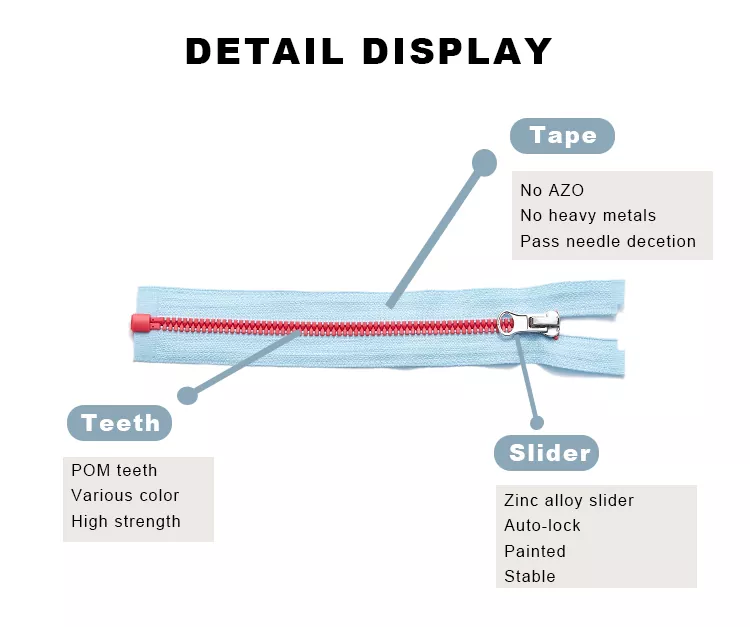 Zip plastik standard TRC adalah suntikan yang diacu daripada polyoxymethylene atau bahan resin berkekuatan tinggi yang lain, yang memastikan gigi terbentuk dengan baik sambil memberikan kelicinan yang sangat baik dan rintangan haus yang luar biasa semasa digunakan. Permukaan mereka menyokong pelbagai rawatan warna dengan ketahanan warna yang sangat baik, membolehkan warna kekal bersemangat untuk masa yang lama. Selain itu, digabungkan dengan pita poliester berkekuatan tinggi, struktur keseluruhannya lebih kukuh dan tahan lama, memenuhi permintaan penggunaan harian yang kerap.